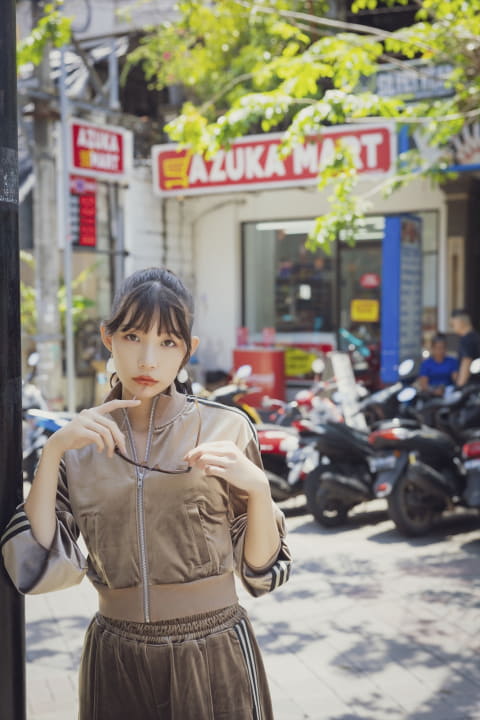 先行カットは、ブラックのボディスーツを着用してのバックショット、ストッキング着用の赤ランジェリー、メガネをかけた秘書姿、キャビンアテンダント風のコスプレ、パールのTバックになったホワイトランジェリー、波崎天結さんがやってみたかったというヤンキー風のジャージ姿でバリの街並みを歩くカットの6枚。