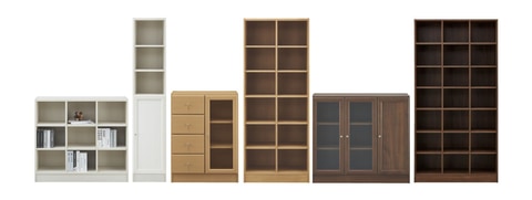 「オープン本棚RVシリーズ」は既製品5サイズがラインナップ。また、既製品と同じデザインでセミオーダーが可能となった。