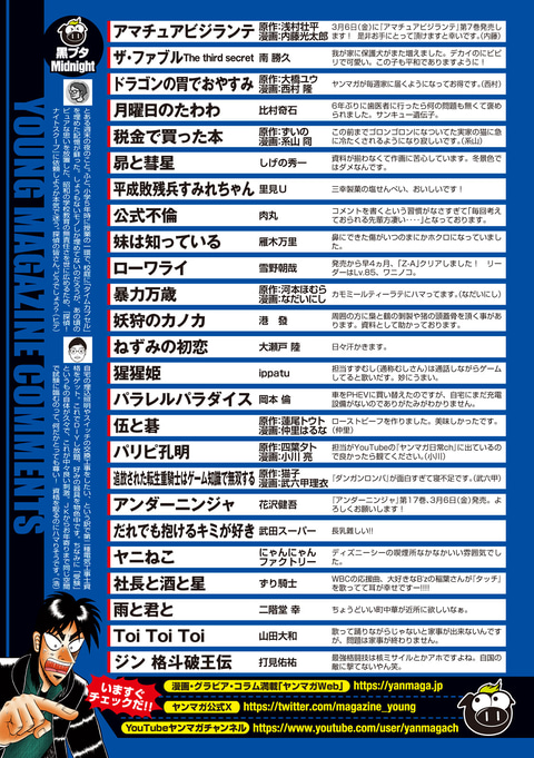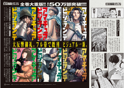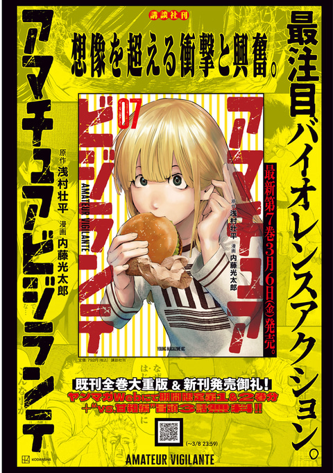 単行本第7巻が3月6日に発売される「アマチュアビジランテ」が巻頭カラーに登場。「ヤンマガWeb」では2巻分と“vs.甘粕編”冒頭3話の期間限定無料公開も実施されている。