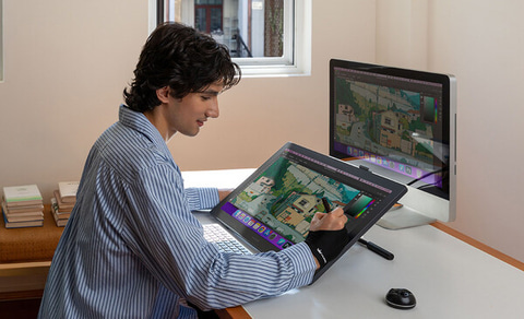 スクリーンのサイズは21.5インチ、解像度は2.5K(2,560×1,440)、リフレッシュレートは90Hz。シャープな解像度で、スムーズに描画できるスペックを備えている。色の再現率はsRGB 99%、Rec. 709 99%、Adobe RGB 90%、Display P3 92%となっており、イラスト制作だけでなく、動画の編集にも威力を発揮しそうだ。