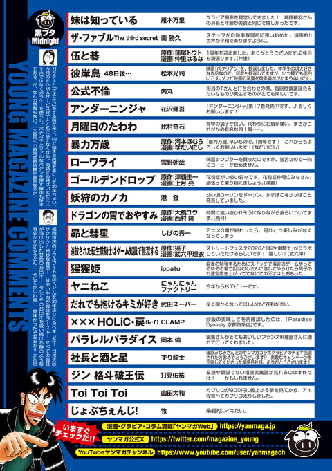 講談社は、マンガ雑誌「週刊ヤングマガジン 2026年16号」を本日3月16日に発売する。価格は510円。