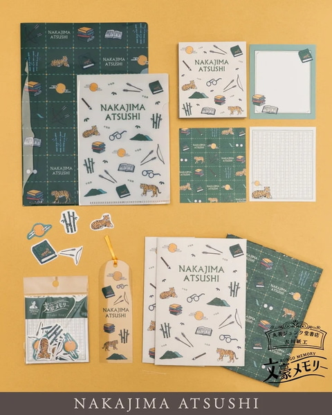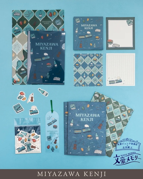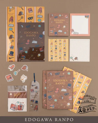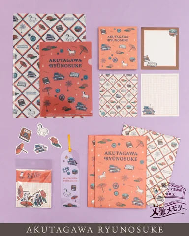 「文豪メモリー」は「文豪」にスポットを当てたオリジナルステーショナリーシリーズ。今回は、宮沢賢治、芥川龍之介、江戸川乱歩、中島敦という文豪4人の作品をモチーフにしたデザインで、A5/A6クリアファイルセット、メモパッド、フレークシール、クリアブックマーカー、美濃和紙ブックカバーの5アイテムを展開する。