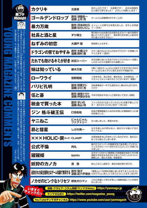 講談社は、マンガ雑誌「週刊ヤングマガジン 2026年20号」を本日4月13日に発売する。価格は510円。