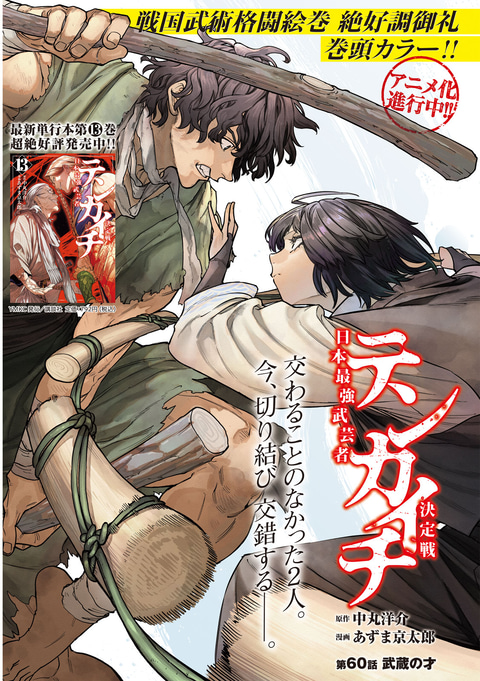 今号の巻頭カラーには、アニメ化も進行している中丸洋介氏×あずま京太郎氏の戦国武術格闘絵巻「テンカイチ 日本最強武芸者決定戦」が掲載されている。