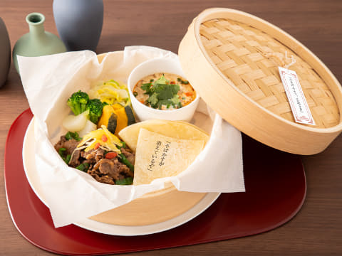生姜やオイスターソースの牛肉がメインのせいろ蒸し。冬の園遊会で生姜や柑橘の皮を使い、体を温めたエピソードを表現。主食は3種類から選択できる。