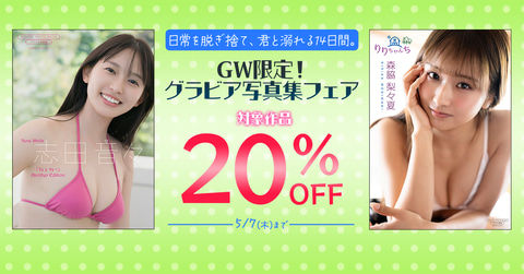 【グラビア】志田音々さんや森脇梨々夏さんの写真集が20%オフに!「日常を脱ぎ捨て、君と溺れる14日間。 GW限定!グラビア写真集フェア」開催中