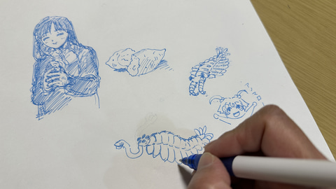 イラストも描いてみた。0.8mmと太字なので、くっきりした主線が引けるが、小さな絵では細部を詳細に描くのはやや難しかった。消し具の縁を使うとエッジを効かせて消すことができるので、ざっくりと描いた後に消し具のエッジを使って細部を調整といった使い方もできる。描いたり消したりしながら全体のフォルムを作っていると時間を忘れられた。ワイヤーフレームの構築や漫画のネームなどでは紙を使う人も多いだろう。そういったコンセプトの構築にはかなり便利なツールとなるのではないだろうか。