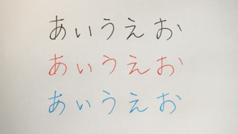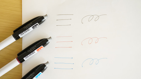 ボールチップはステンレスでボール径は0.8mmの太字。インクの色はブラック、レッド、ブルーの3種類。黒は濃いグレー、赤は鮮やかなレッド、青は発色のいい水色に近いブルーとなっている。油性ボールペンほどクッキリとエッジが効いた濃色ではなく、いずれの色も少し淡い優しい色味で書き味にも柔らかさを感じされる。書いた線は場所によって微妙な濃淡が付く。太字と相まって、まるで極細の筆で書いたようなニュアンスが楽しめる。