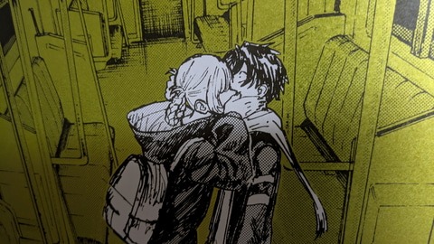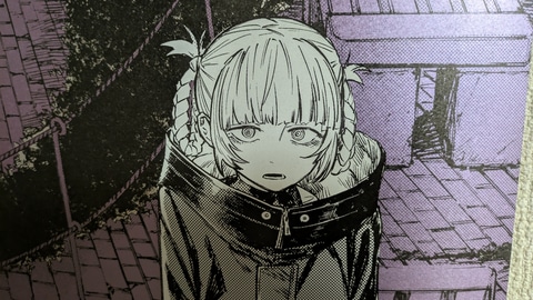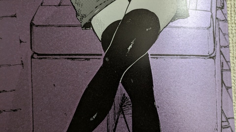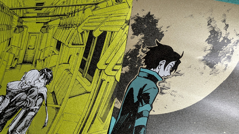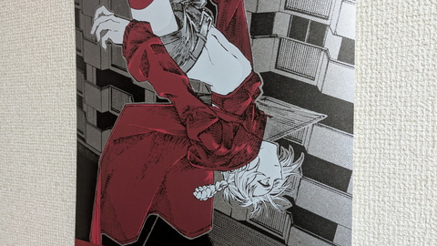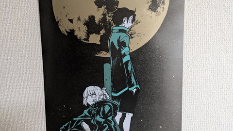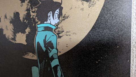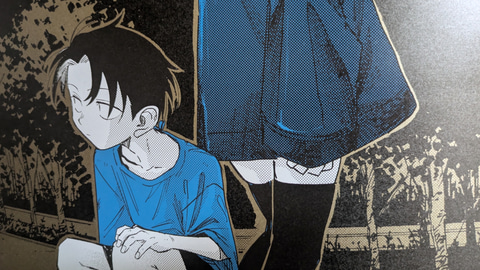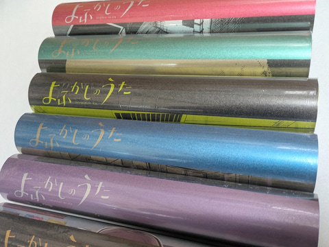 また、商品ページには「メタリックな用紙『ハイピカ』を使用」と書いてある。筆者は不勉強ながらこの紙の詳細を知らなかったのだが、元々「ハイピカ」はマット仕様のアルミ蒸着紙であるらしい。その紙肌にはきめ細やかで鈍く光るような独特の質感があり、「よふかしのうた」の深夜の雰囲気や、各絵柄に配された1色がとても映える。もっと言うなら黒にも独自のテカリが出て、光沢があるにも関わらずより黒く見えるという、さながら光沢液晶のような不思議な仕上がりだ。本くじの単価は一回1,650円と正直若干お高めの設定ではあるのだが、コトヤマ氏の絵柄との相性の良さ、発色の良さもあり、この紙質を見れば納得というところであった。ちなみに、素材として紙は紙なので、キレイに貼るため伸ばす際は折り目がつかないよう細心の注意を払って作業にあたってほしい。