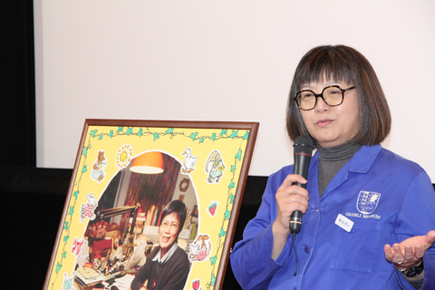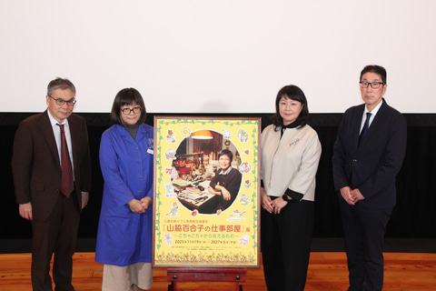 壇上に立った館長の安西さんは、スタジオジブリが山本百合子さんとお付き合いするきっかけとなったことについて、「となりのトトロ」制作時に子供が歌えるうたが欲しいという思いから彼女の姉である中川李枝子さんに作詞をお願いしたことが最初だったと説明。それ以降、百合子さん李枝子さん姉妹とは長きに渡り親交が続いていたが、ジブリ美術館建設中の2000年に山脇百合子さんの自宅を訪問し、そこで仕事部屋を見せてもらったことが今回の展示会に繋がったと安西さん。このときに、いつかはこの部屋を飾れると良いかもと思っていたのが、今回山脇家の方々の協力を得ることができて展示会が実現したとのことだった。