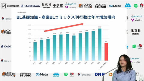商業BLマンガの刊行数は年々増加しており、2024年には約1400作品が出版された。菊池氏によれば、紙のマンガ単行本の発刊総数が約15,000冊で、更にデジタルのみの作品も多数ある。少なくとも10%以上をBL作品が占めていると見ることができる。