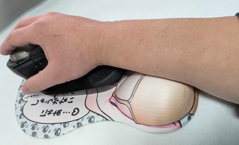 本体とも言えるバスト部分はシリコンがミッチミチに詰まっており、上からグッと押しても底に届かないほど。触り心地は大変に柔らかく、手首のサポートに良さそうだなぁ!と感じる。実際マウスをセットしてみると「そういうプレイなのか?」と思ってしまうような不思議なビジュアルとなるが、手首の持ち上げ具合は大変よろしく、一方で高すぎてややマウスや配置を選ぶかもしれないと思うほど。